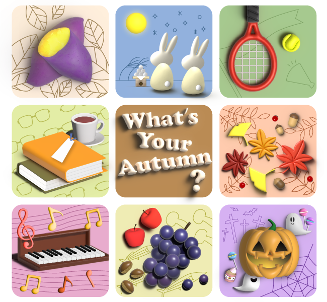 テーマは「どんな秋?」ということで、いろんな秋にちなんだイラストを入れてみました。食欲の秋、読書の秋、芸術の秋…どれも素敵な秋の過ごし方ですね。